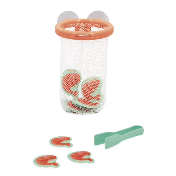 Qui est prêt pour une pêche à la crevette ? 10 petites crevettes se sont échappées dans le bain, il faut vite les attraper en faisant preuve d’agilité ! Grâce à la pince attrape-crevettes, votre enfant peut capturer chaque crevette qui flotte à la surface de l’eau et les déposer dans un joli panier qui se fixe sur la faïence grâce à ses ventouses. A vous d’inventer les règles, le plus rapide à rassembler toutes les crevettes ou en équipe en collaborant chacun son tour à cette pêche hors du commun ! Ce jeu permettra à votre enfant de développer sa dextérité tout en passant un moment amusant dans le bain. Ce jouet pour le bain peut être proposé aux enfants à partir de 2 ans.