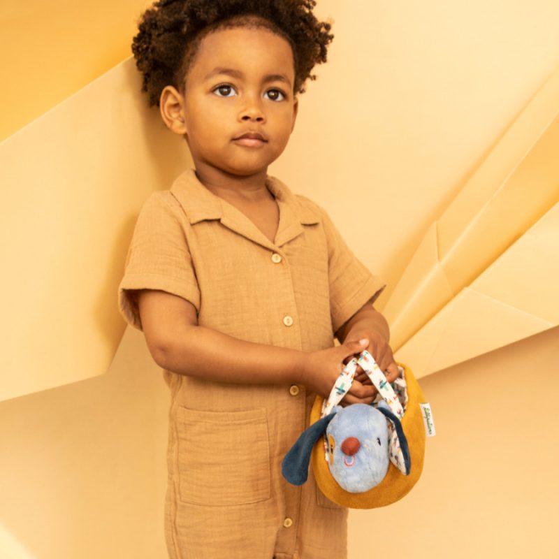 Quel charmant petit chiot dans son panier ! Jules le chien en peluche et ses accessoires feront craquer petits et grands, dès 12 mois. Pour s’amuser et prendre soin de son premier petit chien, votre enfant a tout le nécessaire : un panier réversible avec une face jaune et une face à motifs, un os en tissu, une gamelle en bois avec un imprimé os au fond et une veste amovible. Soit 4 accessoires pour nourrir son chien en peluche, le faire jouer ou dormir tranquillement dans son panier. Avec ses poignées, on peut transporter Jules et ses petites affaires partout où on le souhaite ! En prenant bien soin de lui ou en lui touchant la truffe, il répondra à ses attentions par de joyeux aboiements. Une véritable peluche sonore douce, originale et charmante ! Les petits avions imprimés sur le panier sont assortis à ceux dans les oreilles de Jules. C’est un chien aviateur qui adore l’aventure ! Ses longues oreilles toutes douces sont une extension de plus à cajoler sur cette peluche Lilliputiens. Jules adore enfiler sa veste pour voler dans son avion, mordiller son os préféré et faire la sieste après un bon repas. Avec lui, votre tout-petit développe son imagination et son sens de l’empathie. Doux et joyeux, Jules sera un ami fidèle pour votre enfant. La peluche bleue et ses accessoires sont lavables en machine à 30°, à l’exception des parties en bois. Un copain qui a du chien !