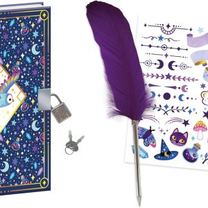 Secrets et sortilèges sont bien gardés avec ce kit créatif pour les enfants à partir de 7 ans ! Avec leur carnet secret de 96 pages, ils peuvent lister les ingrédients de leurs potions magiques ou imaginer des créatures fantastiques. Ça n’est pas seulement un journal intime, c’est une activité créative idéale pour s’exprimer sans limites grâce à la planche de décalcomanies et au stylo inclus ! Et pour que tous les secrets des enfants soient impénétrables, un cadenas et son jeu de 2 clés complètent le carnet. Pour apporter une touche magique à ce coffret créatif, le stylo en forme de plume est à encre violette ! Au fil des pages, cristaux enchantés et accessoires oniriques garderont précieusement toutes les petites confidences des enfants. Ecrire dans un petit carnet est un chouette moyen d’exprimer sa créativité, sa personnalité, et de développer son imagination ! Les enfants peuvent alors décrire leur journée passée à jouer les sorciers ou sorcières, tout comme leur journée à l’école, selon leur humeur du moment. Les coloris pourpres de ce grimoire secret invitent à la magie et à l’envoutement ! Explorez les mystères de la magie avec la collection « Magic School », des kits de loisirs créatifs pour enfant sur le thème des apprenti(e)s sorcier(ère)s, pour des après-midis créatifs et enchantés !