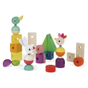 Bienvenue à bord du train Géant Zigolos ! Prenez place, nous allons bientôt partir ! Ce jouet 2 en 1 en bois est un jouet premier âge à promener pour aider les tout-petits à développer leur motricité mais aussi un jeu à empiler. Grâce aux nombreux blocs à placer sur les wagons, les bébés à partir de 1 an vont apprendre les formes et les couleurs en s’amusant. Le Train Géant Zigolos est un jouet complet que votre enfant appréciera tout particulièrement pour ses jolies couleurs et les animaux rigolos du wagon ! Et pour cause, leur tête montée sur ressort se dandine dès que le véhicule se met en marche ! Le canard, la poulette et le lapin sont prêts à découvrir l’univers de bébé ! On s’amuse recréer à l’identique ou à associer les cubes en bois selon ses envies. Pour plus de confort, les roues sont silencieuses grâce au caoutchouc antidérapant. Longueur de la ficelle : 50 cm. Peinture à l’eau.